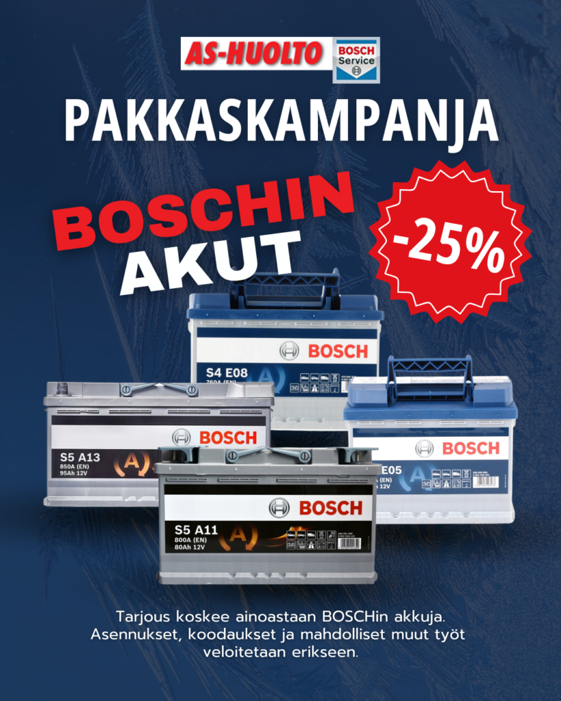 Tarjous koskee ainoastaan BOSCH akkuja. Asennukset, koodaukset ja mahdolliset muut työt veloitetaan erikseen.
